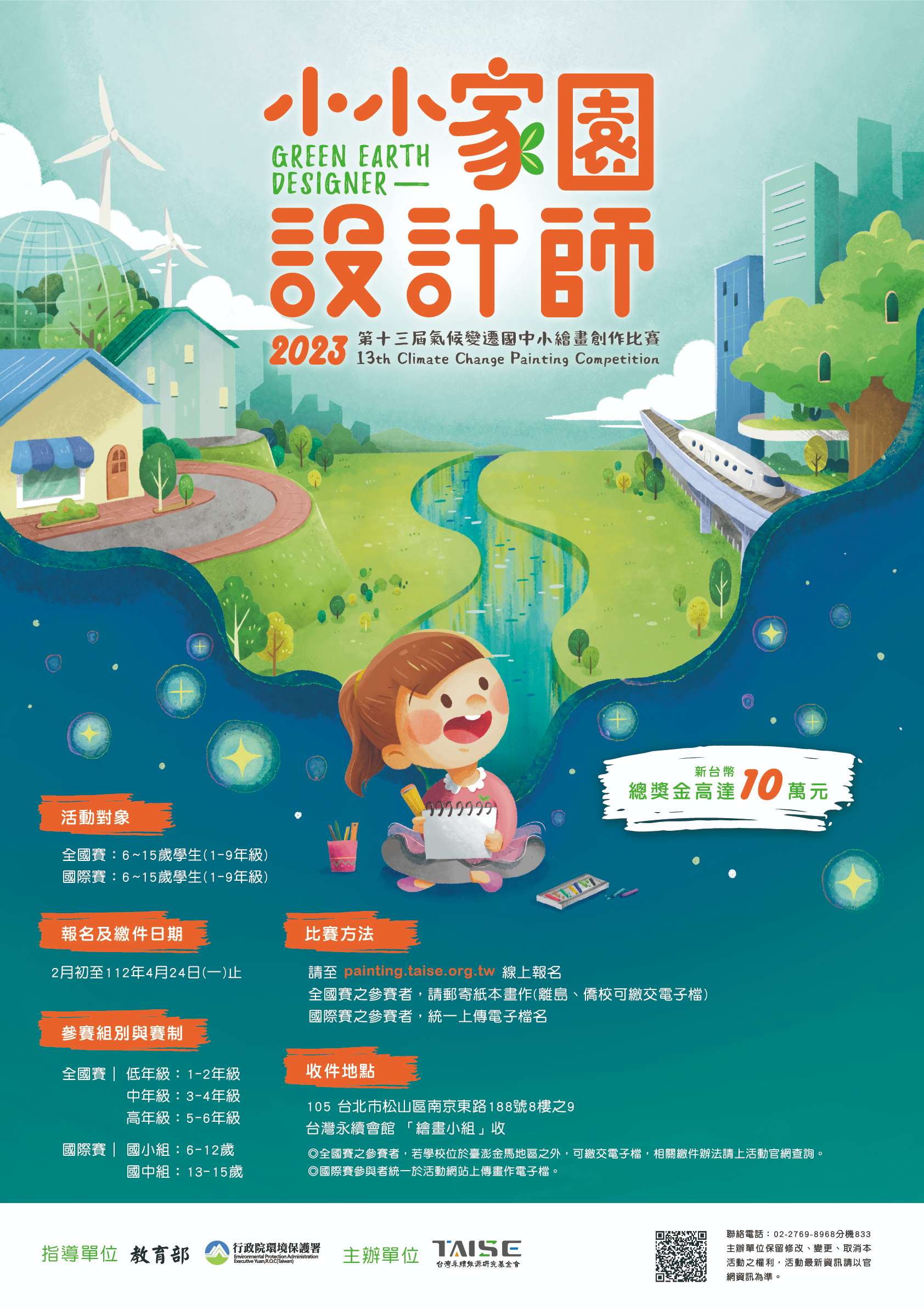 一、由教育部、行政院環境保護署指導,台灣永續能源研究基金會主辦之「氣候變遷國中小繪畫創作比賽」迄今已舉辦12屆,累計40國、59,152名學子參與。本屆(第13屆)為呼應聯合國永續發展目標(SDGs)的第11項,以「小小家園設計師」為主題,提升國中小師生關注天然災害對城市造成的損傷,思考如何降低城市垃圾和空氣污染,同時重視社區文化與自然遺產