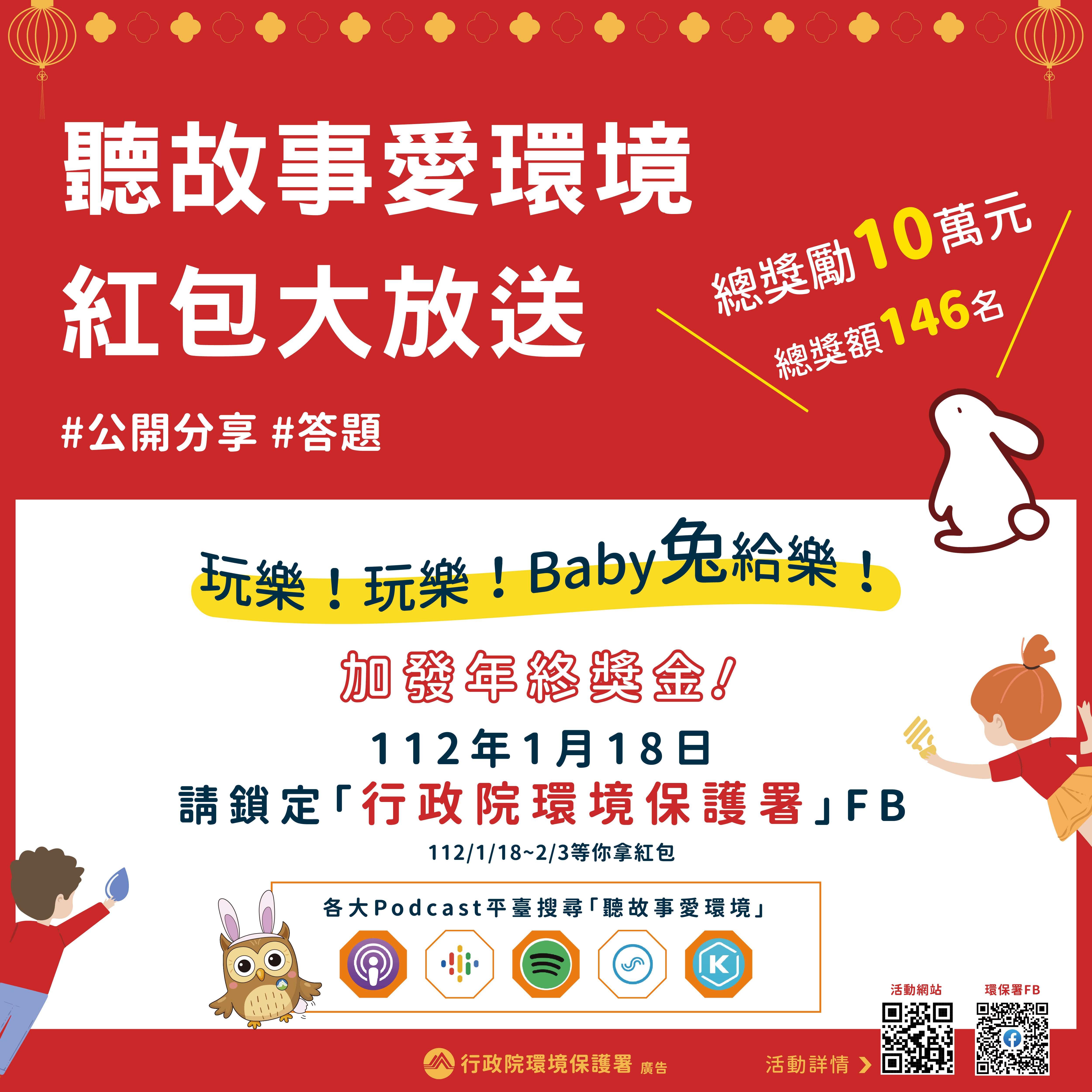 二、為增進「聽故事愛環境」節目效益,於農曆新年期間辦理旨揭活動,本活動期間為112年1月18日(星期三)至2月3日(星期五),只要至「行政院環境保護署」臉書粉絲專頁完成指定「任務題」或「知識題」,即可有機會抽中超商禮券或環保綠點,總獎額146名,總獎值高達新臺幣 10萬元。