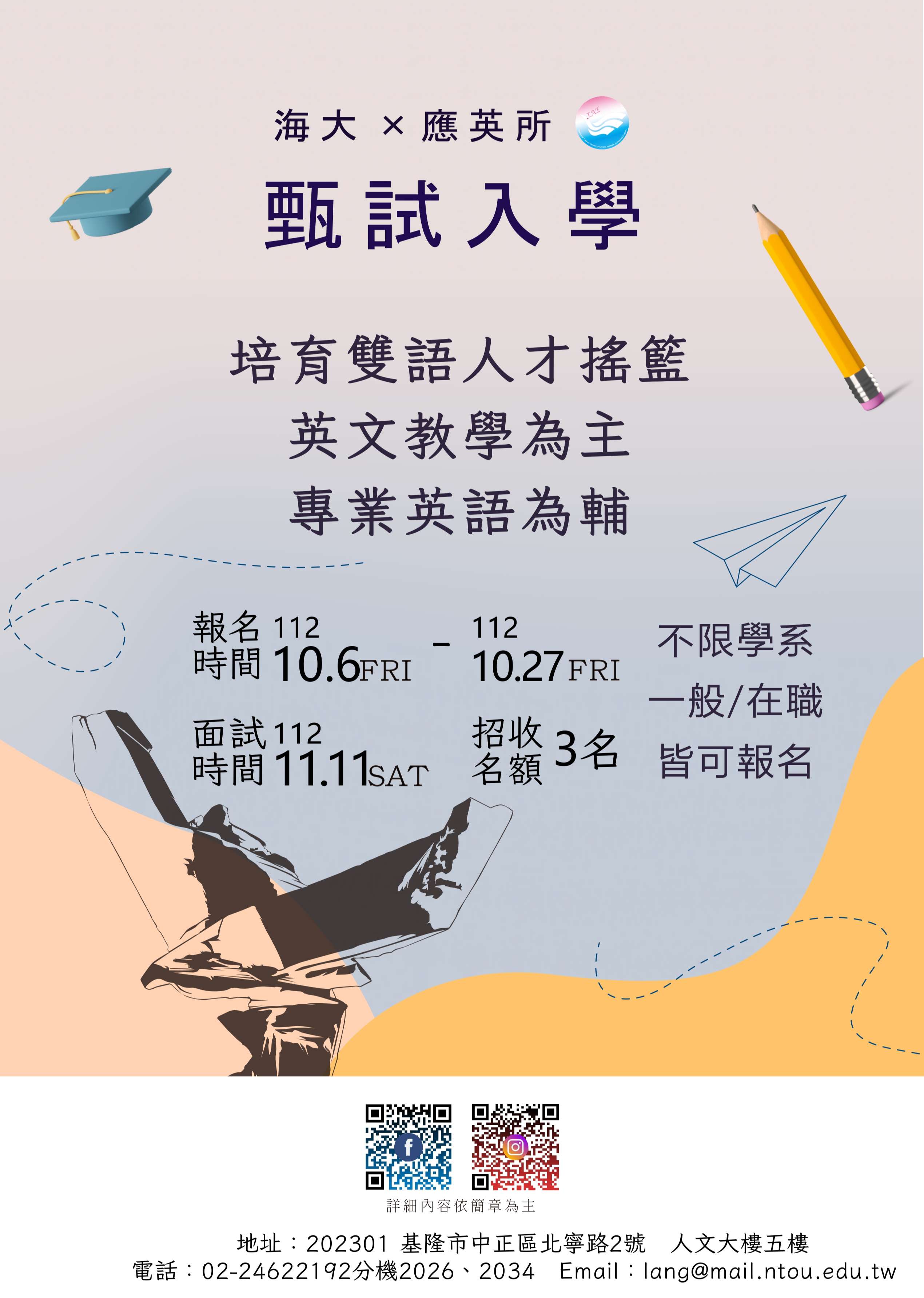 四、甄試入學面試日期:112年11月11日(星期六)上午10時。 五、相關資訊請參閱附件招生海報,或請至本校首頁點選「招 生資訊」。 六、參考網址:https://langiae.ntou.edu.tw/。