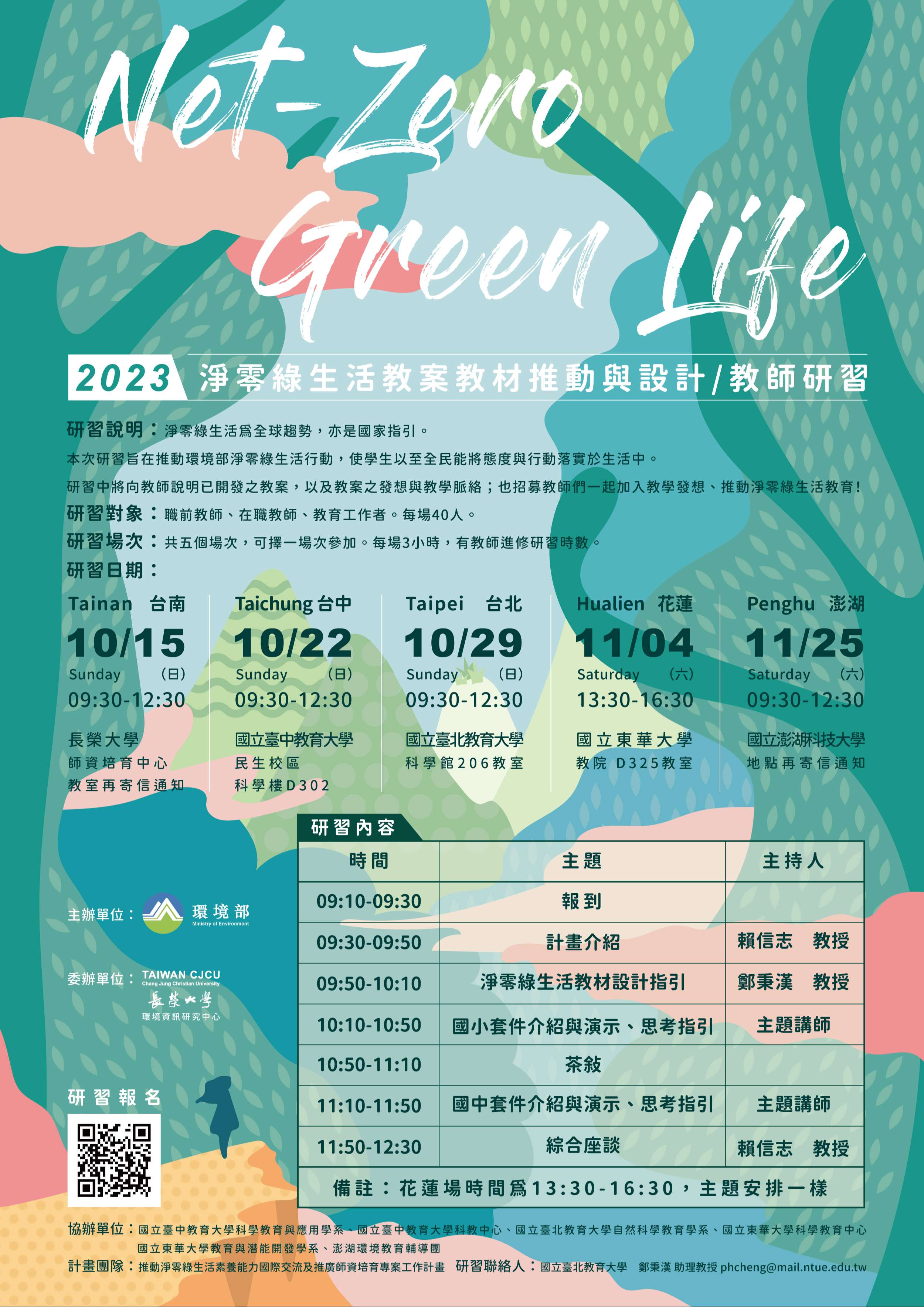 二、研習中將向教師說明已開發之教案,及教案之發想與教學脈絡;並招募教師加入教學發想,推動淨零綠生活教育。
