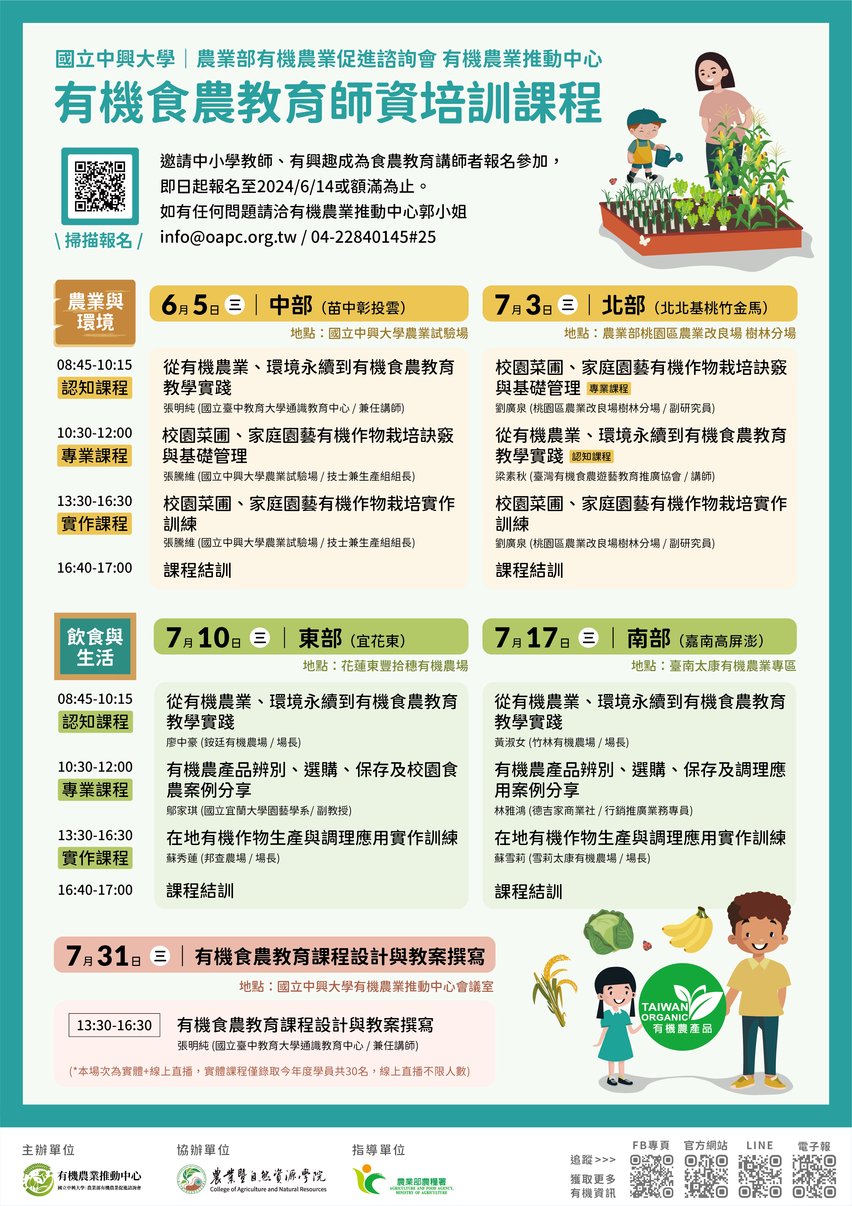 (四)113年7月17日(星期三)08:45-17:00,「從有機農業、 環境永續到有機食農教育教學實踐」、「有機農產品辨 別、選購、保存及調理應用案例分享」、「在地有機作 物生產與調理應用實作訓練」,課程地點:臺南太康有機農業專區。 (五)113年7月31日(星期三)13:30-16:30,「有機食農教育 課程設計與教案撰寫」(實體暨線上直播),課程地點:國立中興大學有機農業推動中心會議室。
